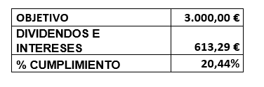 4.3 Obtener unos dividendos e intereses totales de 3.000 €. Nos queda media año y el objetivo sigue inalterable. Difícil sí pero no imposible. Lo veremos: