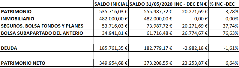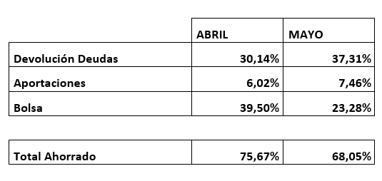 4.1 Mejora de la tasa de ahorro. Olé olé, en casa nos hemos aplicado la tasa de ahorro a mejorado hasta el 75,67 % en Abril y el 68,05 % de Mayo.