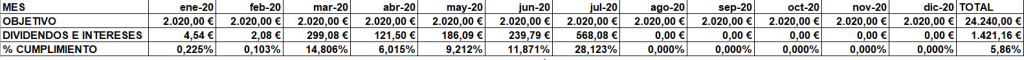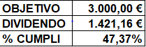 4.3 Obtener unos dividendos e intereses totales de 3.000 €. Nos queda media año y el objetivo sigue inalterable. Difícil sí pero no imposible. Lo veremos: