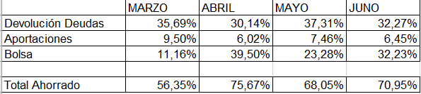 4.1 Mejora de la tasa de ahorro. Olé olé, en casa nos hemos aplicado la tasa de ahorro se mantiene al 68,05 % en Mayo y 70,95 % en Junio